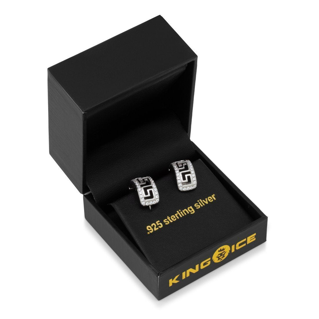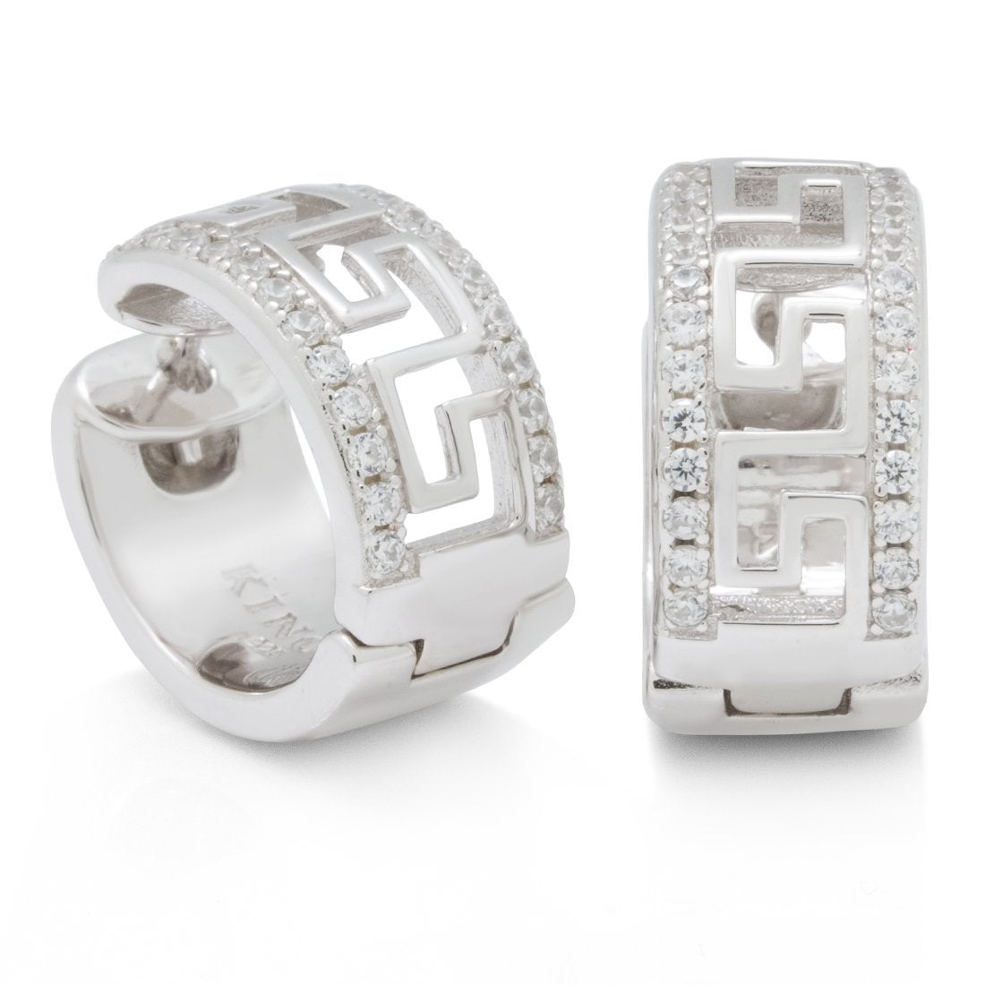 Our Greek Key Hoop Earrings are made from .925 Sterling Silver and available in 14K gold plating, white gold plating, and rose gold plating. Iced with handset VVS Diamond Simulate Stones these earring feature an iconic Greek Key design etched into the center of each band.